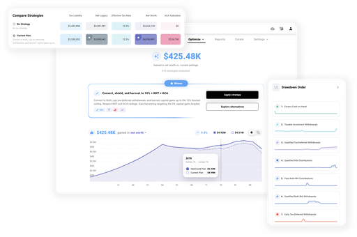 Optimize the objectives that matter most, from lower lifetime taxes to higher net legacy. The Optimizer evaluates hundreds of strategies to find the winner, analysis that would cost thousands from an advisor, in seconds.